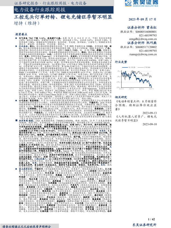 【东吴证券】【20230917】电力设备行业跟踪周报:工控龙头订单好转、锂电光储旺季暂不明显-42页