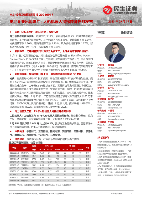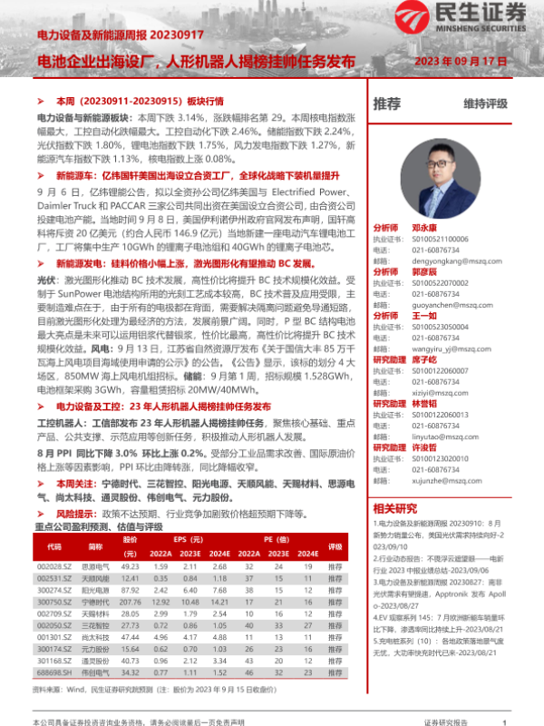 【民生证券】【20230917】电力设备及新能源周报:电池企业出海设厂,人形机器人揭榜挂帅任务发布-24页