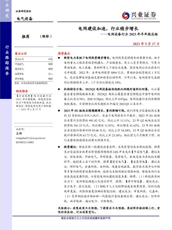 【兴业证券】【20230917】电网建设加速,行业稳步增长——电网设备行业2023年半年报总结-18页