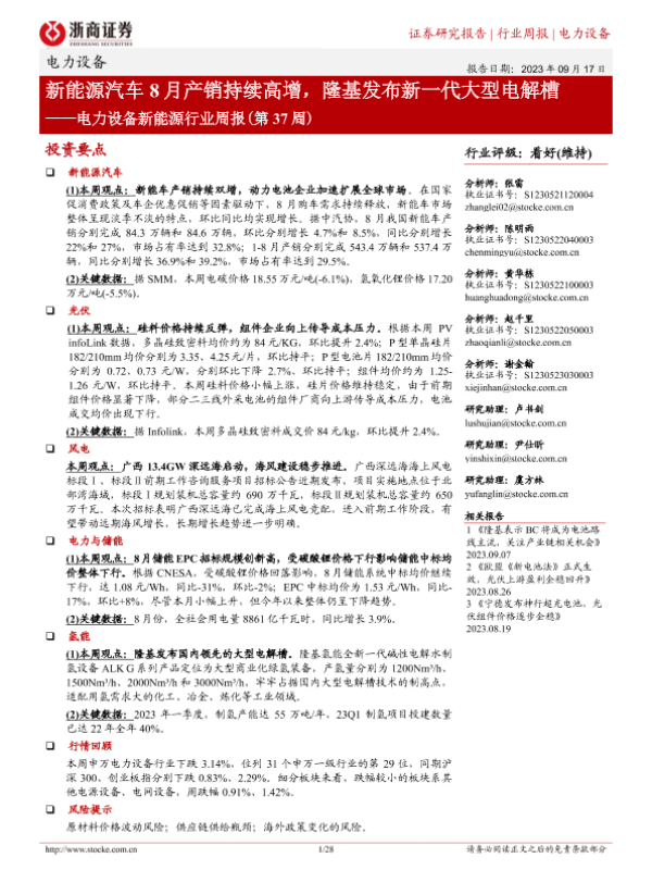 【浙商证券】【20230917】电力设备新能源行业周报(第37周):新能源汽车8月产销持续高增,隆基发布新一代大型电解槽-28页