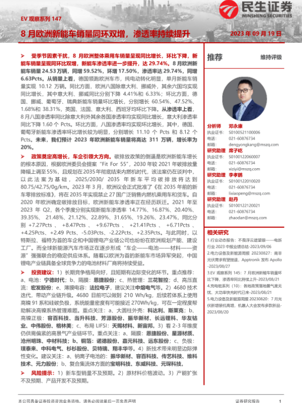 【民生证券】【20230919】EV观察系列147-8月欧洲新能车销量同环双增,渗透率持续提升-21页
