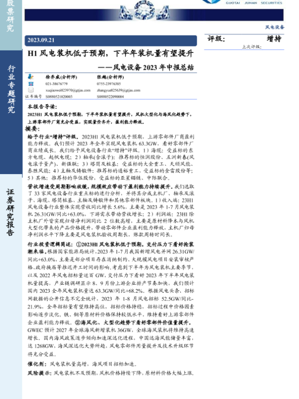 【国泰君安证券】【20230921】风电设备2023年中报总结:H1风电装机低于预期,下半年装机量有望提升-19页