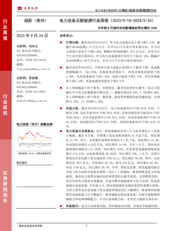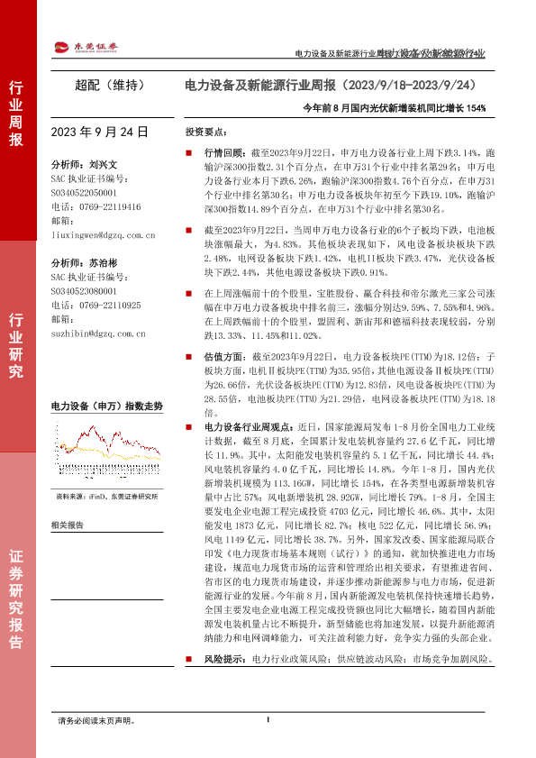 【东莞证券】【20230924】20230924-东莞证券-电力设备及新能源行业周报:今年前8月国内光伏新增装机同比增长154%-14页