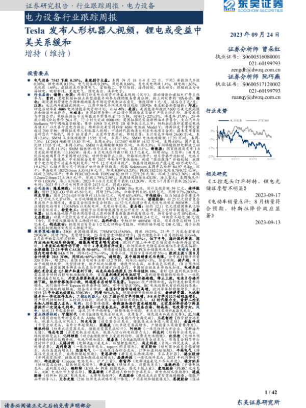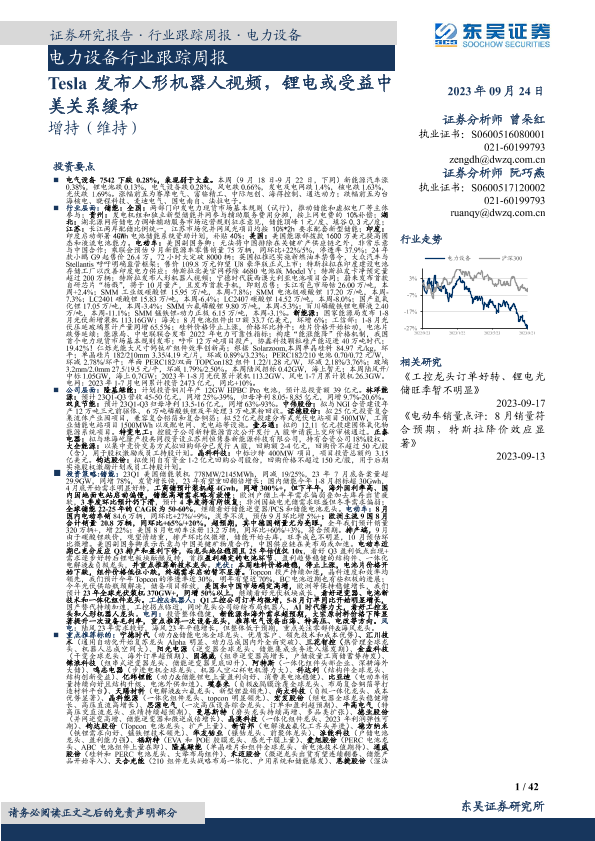 【东吴证券】【20230924】电力设备行业跟踪周报:Tesla发布人形机器人视频,锂电或受益中美关系缓和-42页