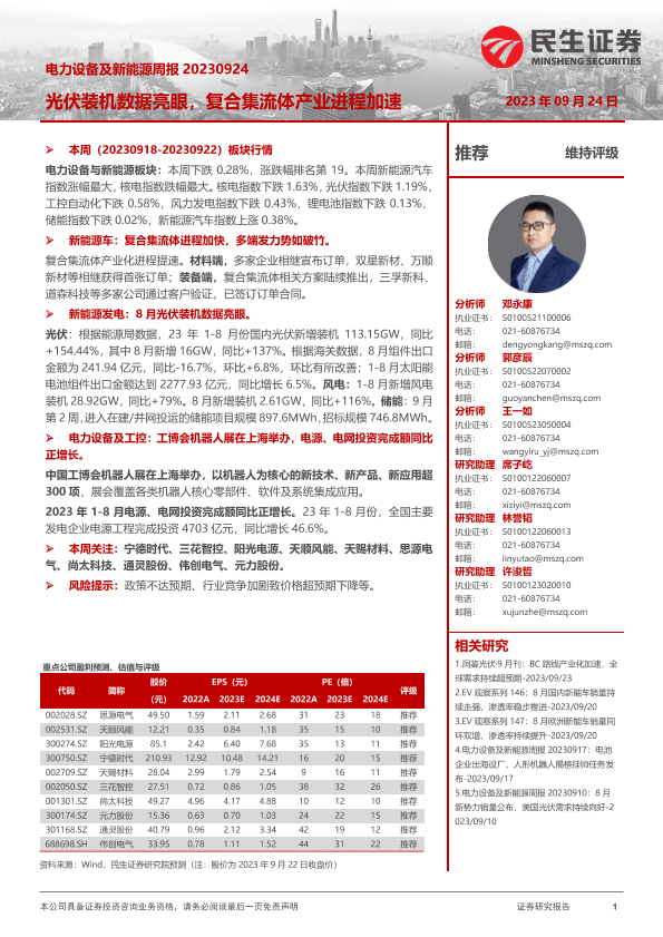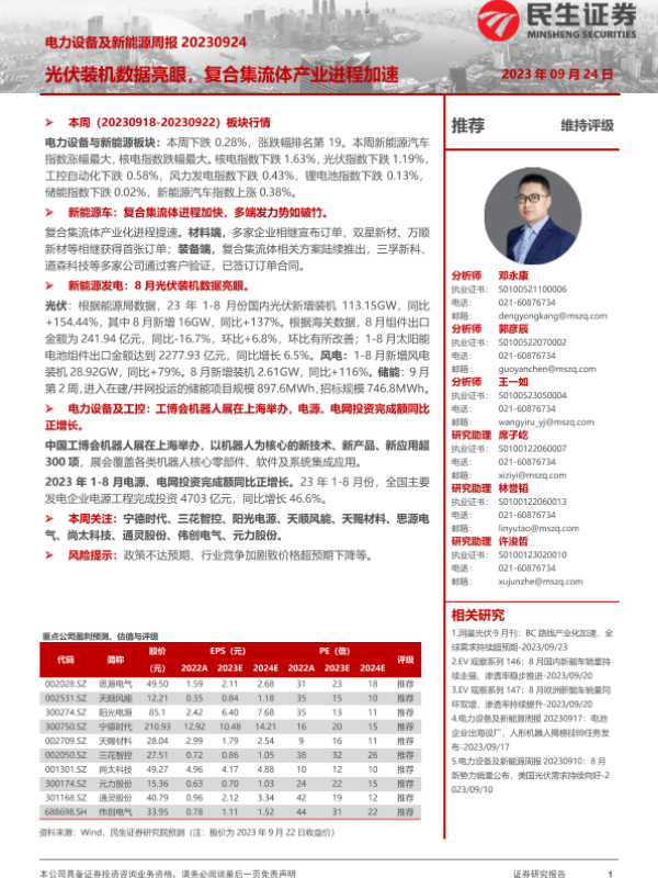 【民生证券】【20230924】电力设备及新能源周报:光伏装机数据亮眼,复合集流体产业进程加速-27页
