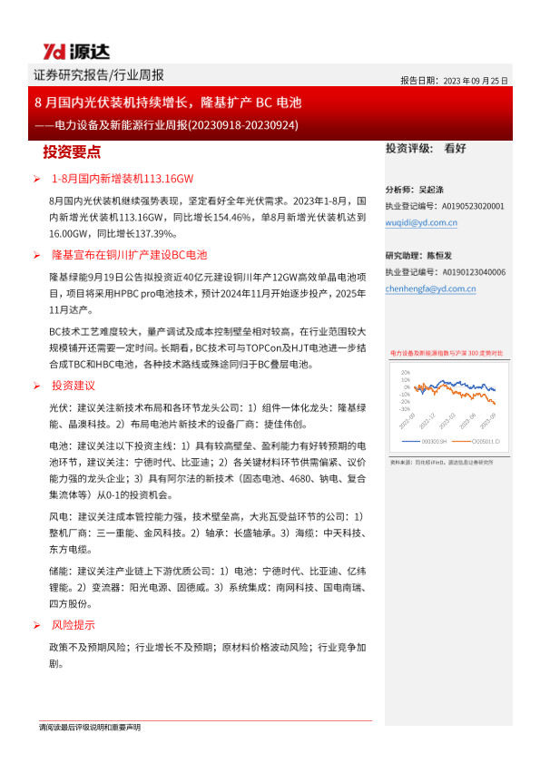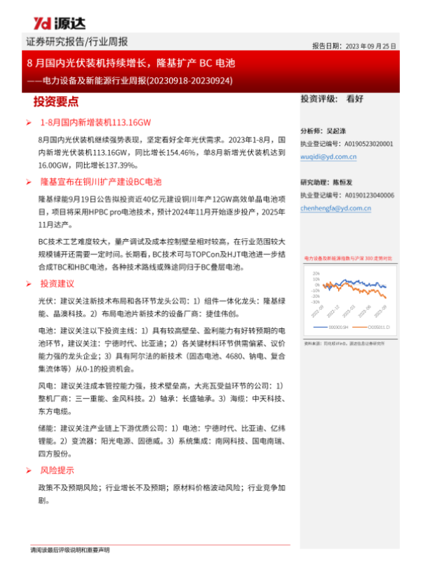 【源达信息】【20230925】20230925-源达信息-电力设备及新能源行业周报:8月国内光伏装机持续增长,隆基扩产BC电池-10页