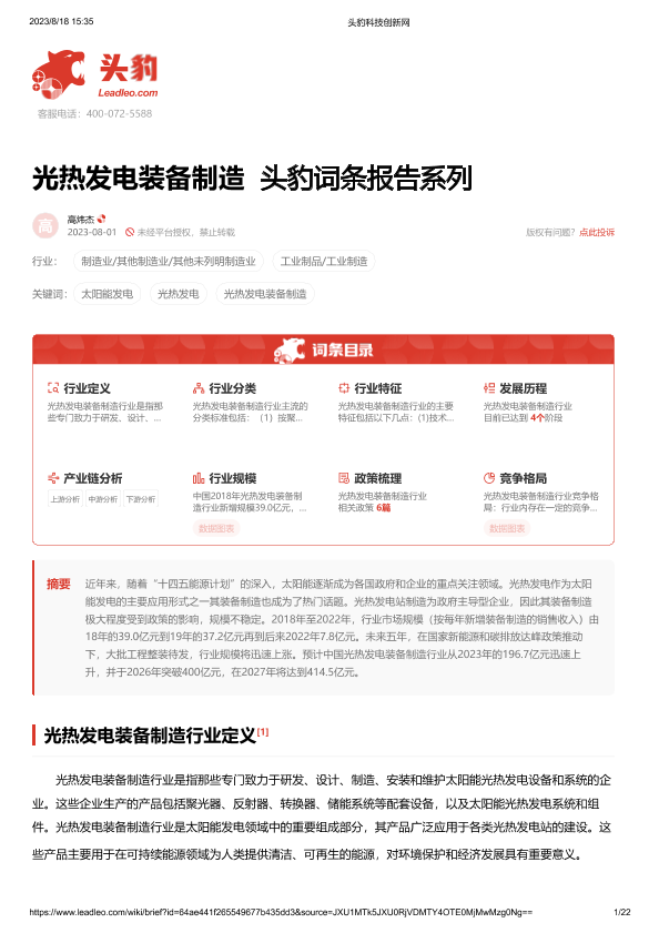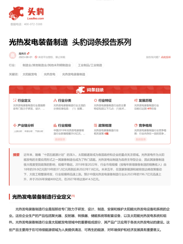 【头豹研究院】【20230801】光热发电装备制造 头豹词条报告系列-22页