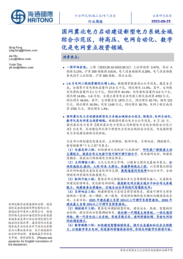 【海通国际】【20230925】20230925-海通国际-电气设备行业周报:国网冀北电力启动建设新型电力系统全域综合示范区,特高压、电网自动化、数字化是电网重点投资领域-10页