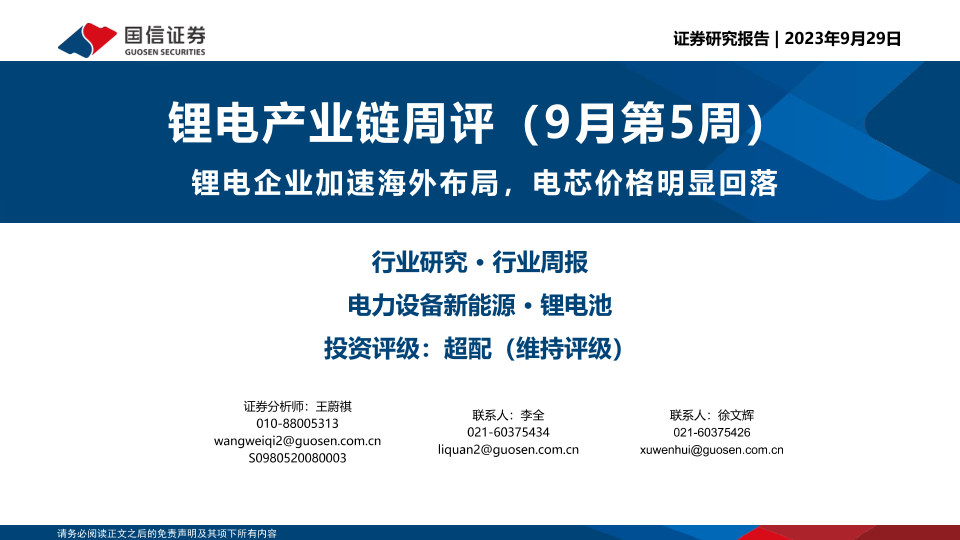 【国信证券】【20230929】锂电产业链周评(9月第5周):锂电企业加速海外布局,电芯价格明显回落-21页