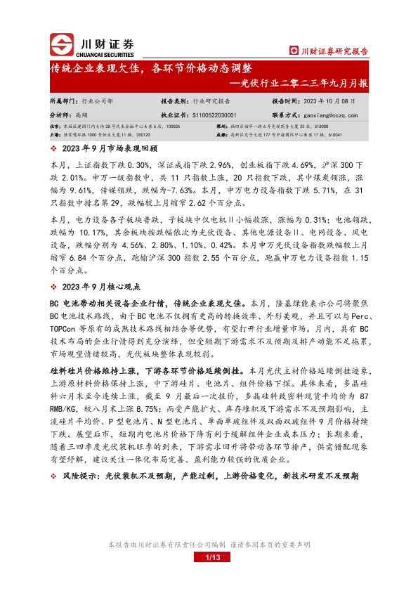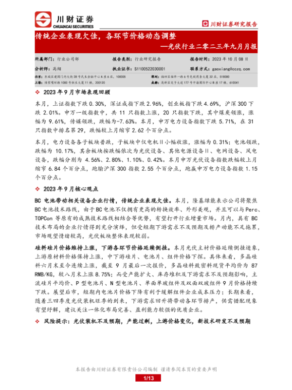 【川财证券】【20231008】光伏行业二零二三年九月月报:传统企业表现欠佳,各环节价格动态调整-13页