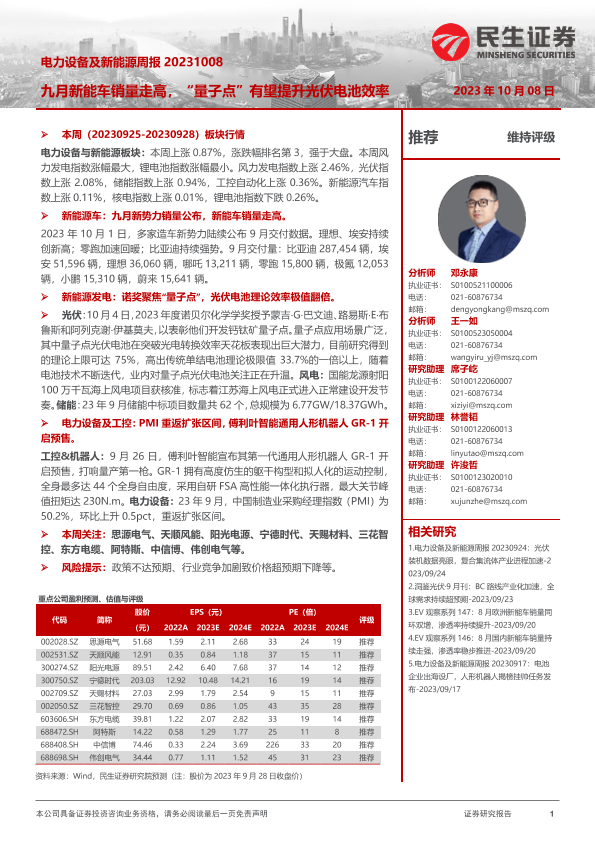 【民生证券】【20231008】电力设备及新能源周报:九月新能车销量走高,“量子点”有望提升光伏电池效率-26页