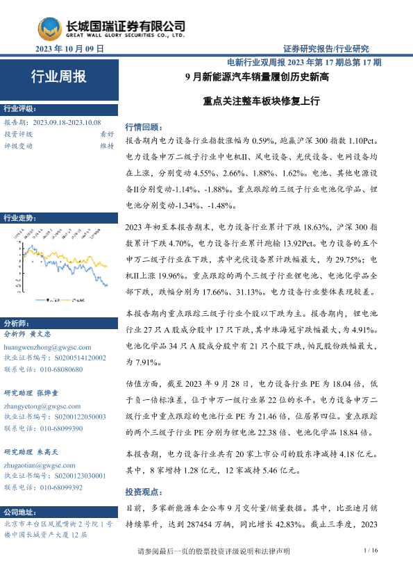 【长城国瑞证券】【20231009】20231009-长城国瑞证券-电新行业双周报2023年第17期总第17期:9月新能源汽车销量履创历史新高 重点关注整车板块修复上行-16页