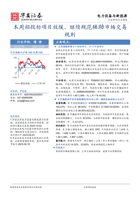 【华安证券】【20231009】20231009-华安证券-电力设备与新能源行业周报:本周招投标项目放缓,继续规范辅助市场交易规则-15页