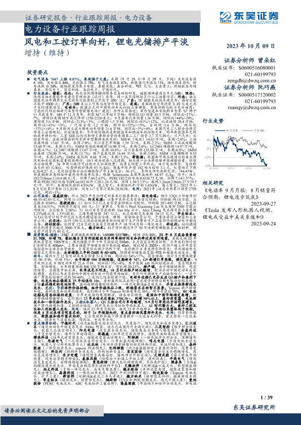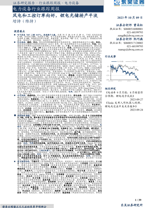 【东吴证券】【20231009】电力设备行业跟踪周报:风电和工控订单向好,锂电光储排产平淡-39页