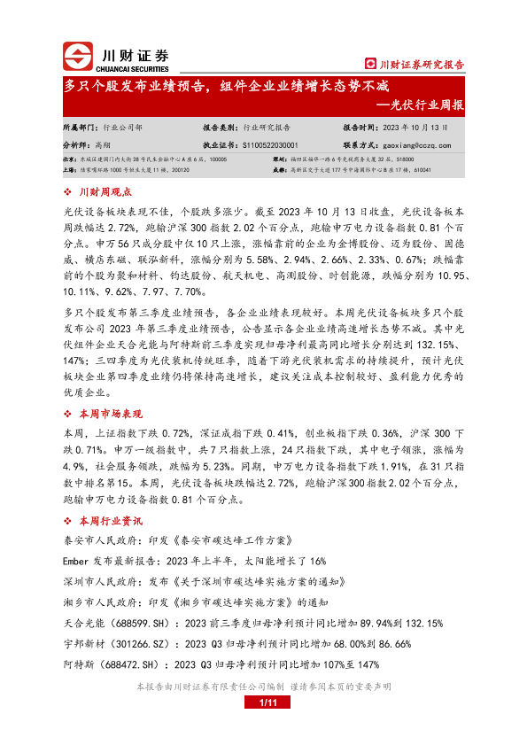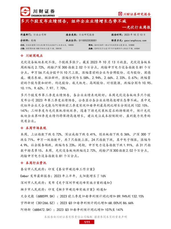 【川财证券】【20231013】20231013-川财证券-光伏行业周报:多只个股发布业绩预告,组件企业业绩增长态势不减-11页
