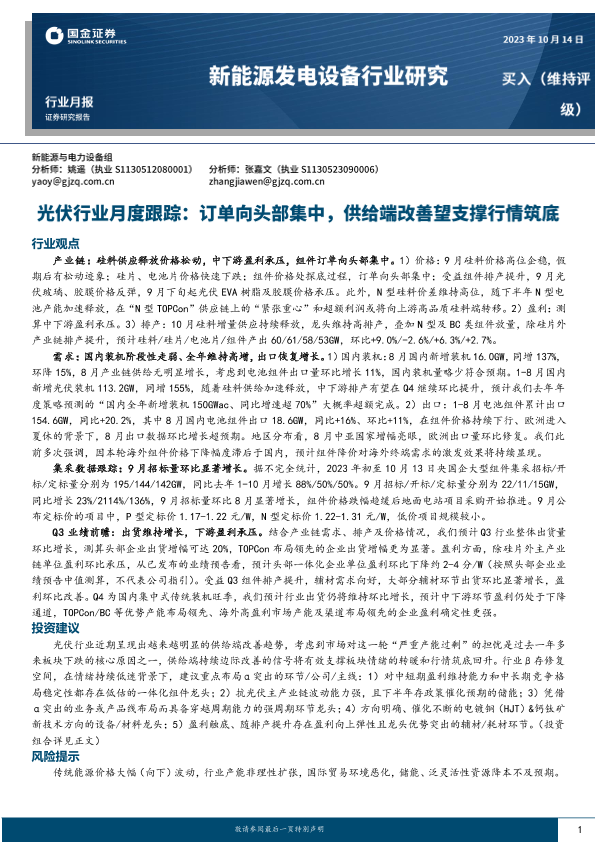 【国金证券】【20231014】光伏行业月度跟踪:订单向头部集中,供给端改善望支撑行情筑底-18页