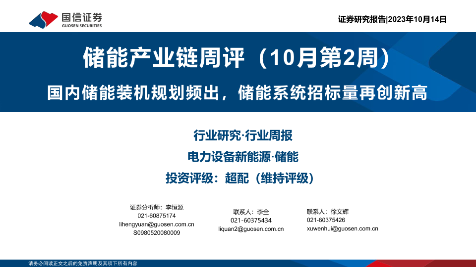 【国信证券】【20231014】储能产业链周评(10月第2周):国内储能装机规划频出,储能系统招标量再创新高-23页