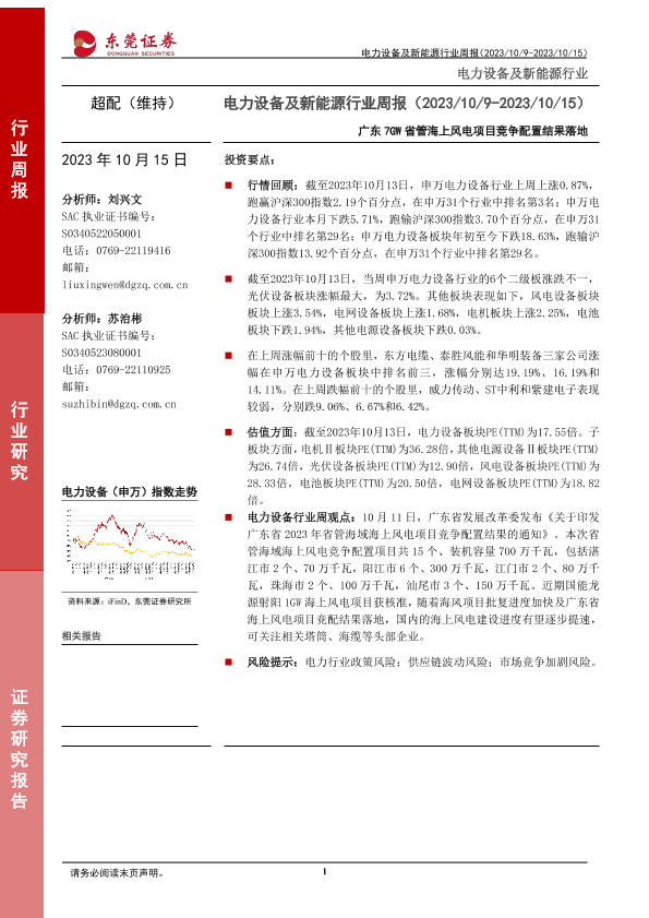 【东莞证券】【20231015】电力设备及新能源行业周报:广东7GW省管海上风电项目竞争配置结果落地-12页