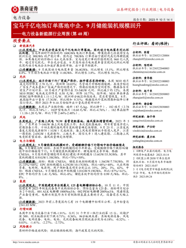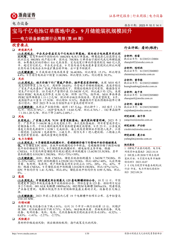 【浙商证券】【20231014】电力设备新能源行业周报(第40周):宝马千亿电池订单落地中企,9月储能装机规模回升-30页