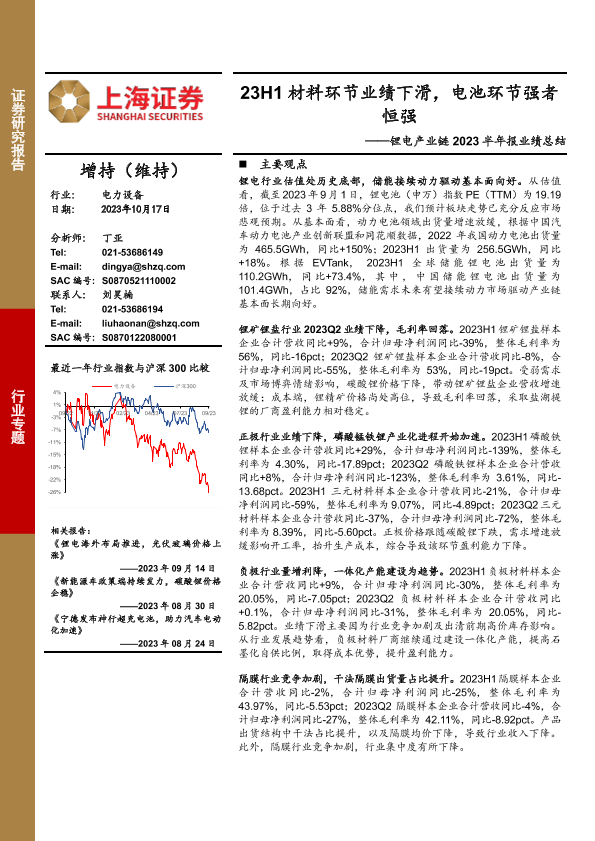 【上海证券】【20231017】23H1材料环节业绩下滑,电池环节强者恒强——锂电产业链2023半年报业绩总结-26页