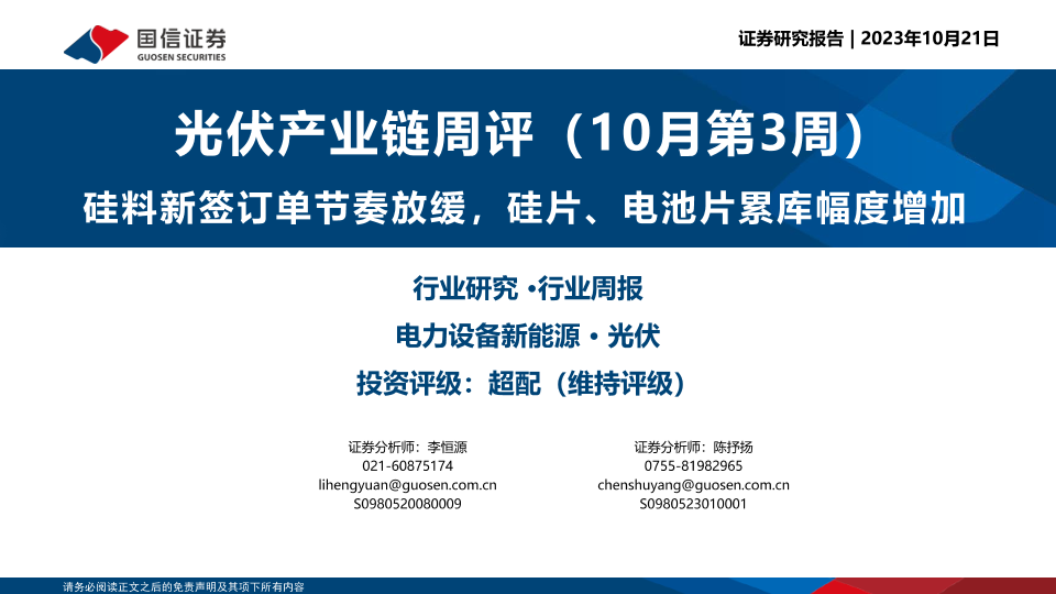 【国信证券】【20231021】光伏产业链周评(10月第3周):硅料新签订单节奏放缓,硅片、电池片累库幅度增加-16页
