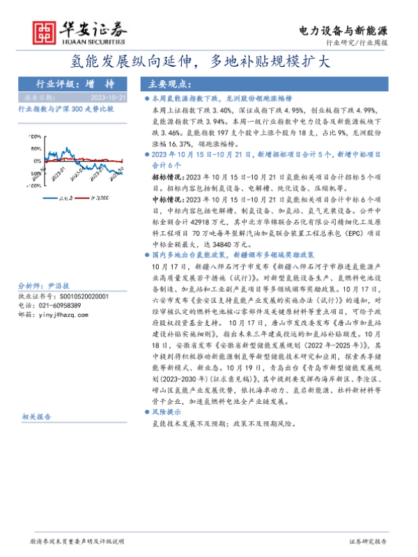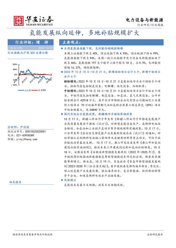 【华安证券】【20231021】电力设备与新能源行业周报:氢能发展纵向延伸,多地补贴规模扩大-13页