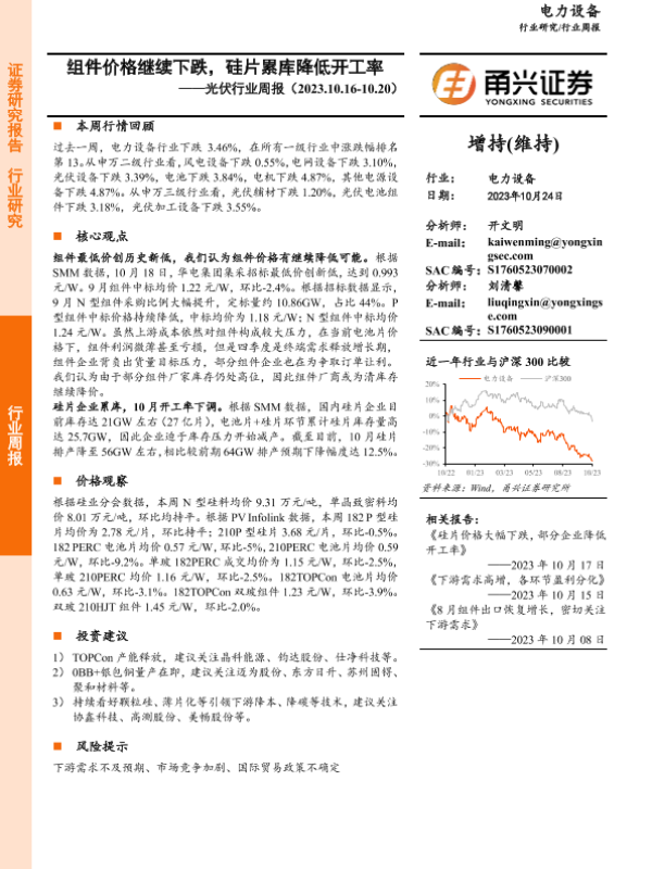 【甬兴证券】【20231024】光伏行业周报:组件价格继续下跌,硅片累库降低开工率-15页