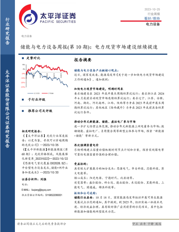 【太平洋证券】【20231025】储能与电力设备周报(第10期):电力现货市场建设继续提速-14页