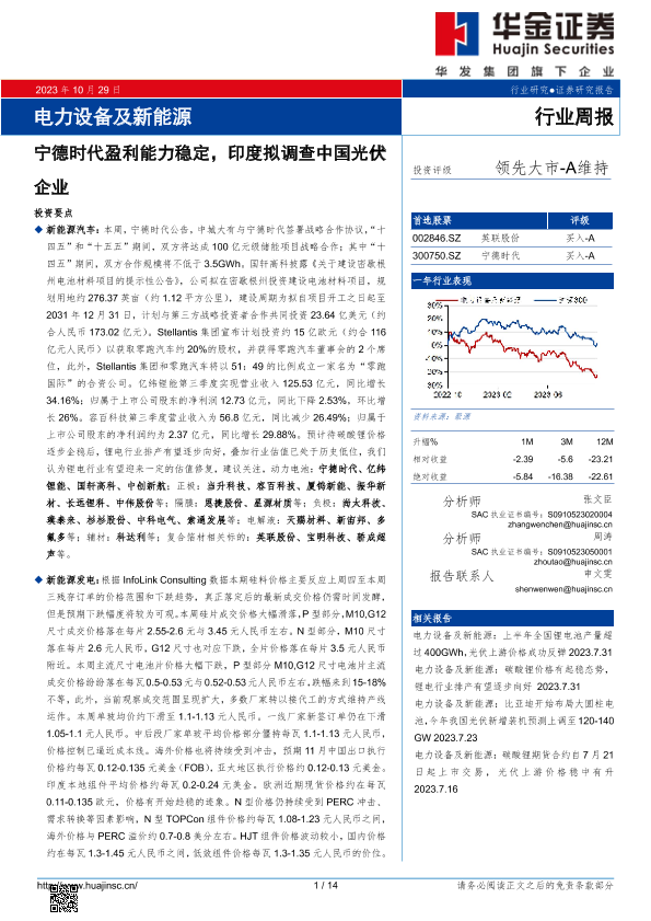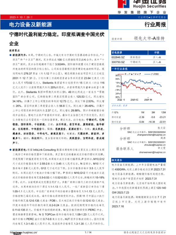 【华金证券】【20231029】电力设备及新能源行业周报:宁德时代盈利能力稳定,印度拟调查中国光伏企业-14页