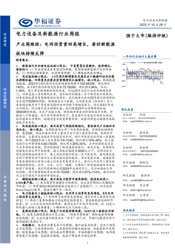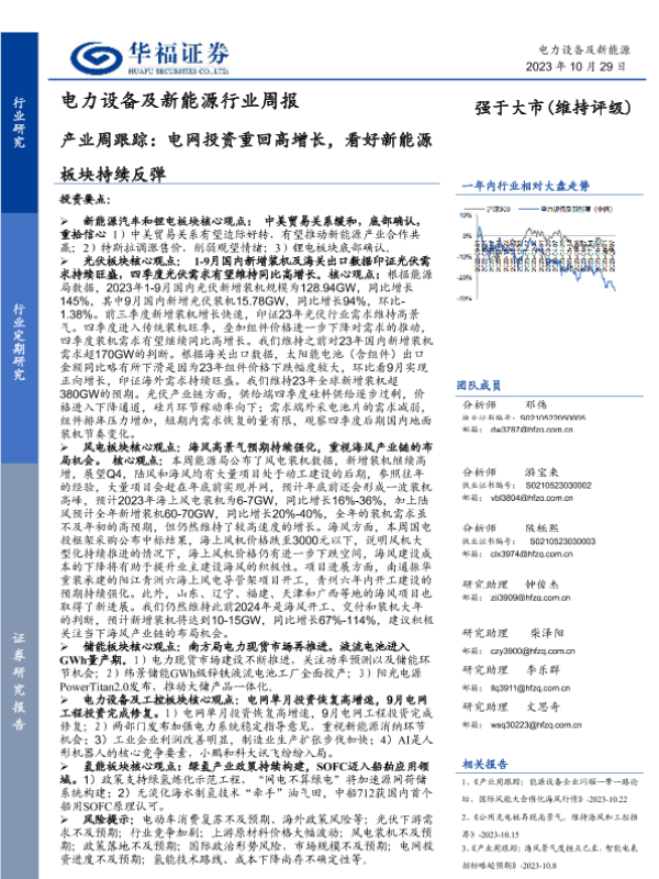 【华福证券】【20231029】电力设备及新能源行业周报:产业周跟踪:电网投资重回高增长,看好新能源板块持续反弹-15页