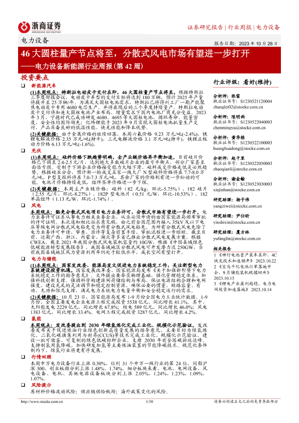 【浙商证券】【20231028】电力设备新能源行业周报(第42周):46大圆柱量产节点将至,分散式风电市场有望进一步打开-30页