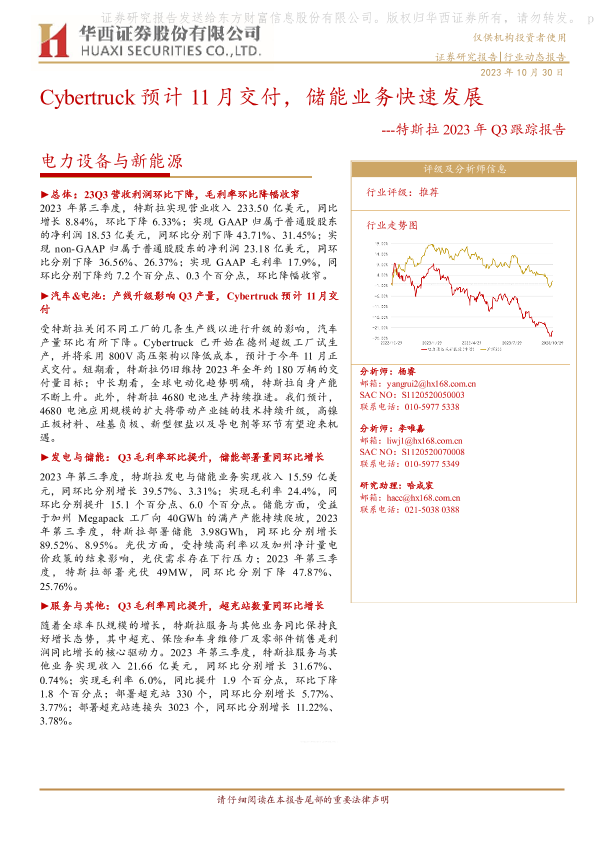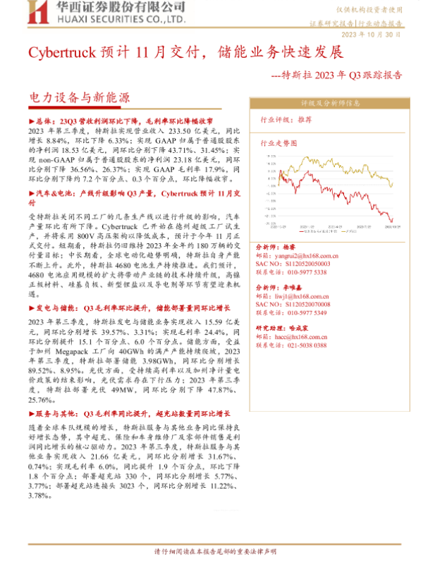【华西证券】【20231030】Cybertruck预计11月交付,储能业务快速发展---特斯拉2023年Q3跟踪报告-13页