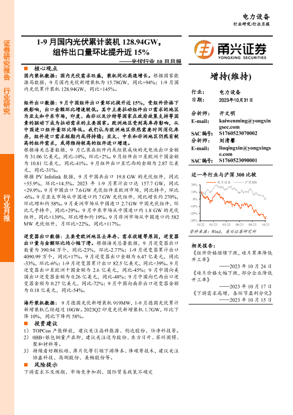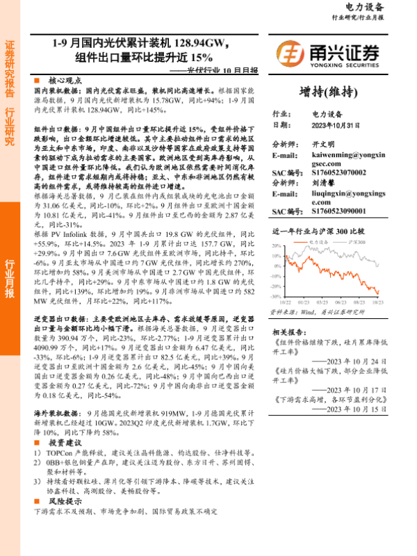 【甬兴证券】【20231031】20231031-甬兴证券-光伏行业10月月报:1-9月国内光伏累计装机128.94GW,组件出口量环比提升近15%-11页