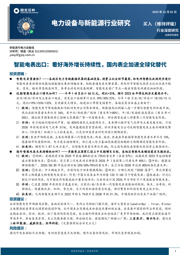 【国金证券】【20231101】电力设备与新能源行业研究:智能电表出口:看好海外增长持续性,国内表企加速全球化替代-26页