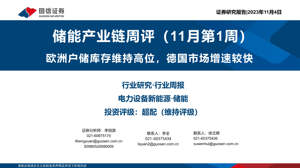 【国信证券】【20231104】储能产业链周评(11月第1周):欧洲户储库存维持高位,德国市场增速较快-26页