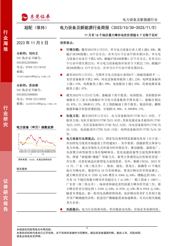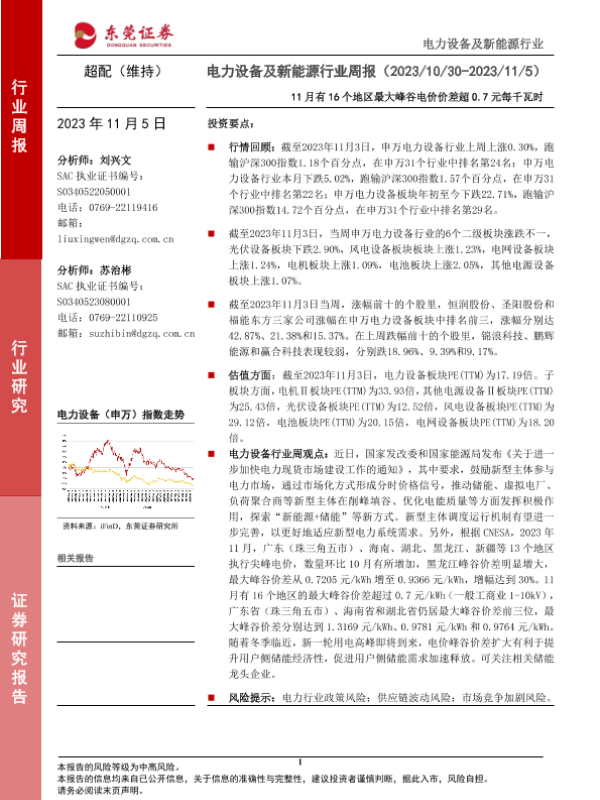 【东莞证券】【20231105】电力设备及新能源行业周报:11月有16个地区最大峰谷电价价差超0.7元每千瓦时-12页