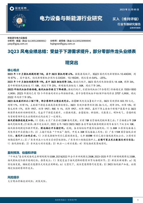 【国金证券】【20231105】20231105-国金证券-电力设备与新能源行业研究:3Q23风电业绩总结:受益于下游需求提升,部分零部件龙头业绩表现突出-11页