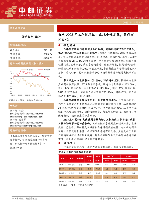 【中邮证券】【20231104】锂电2023年三季报总结:需求小幅复苏,盈利有所分化-17页