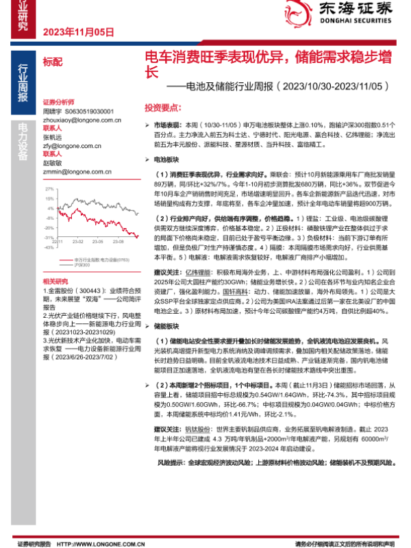【东海证券】【20231105】电车消费旺季表现优异,储能需求稳步增长-12页