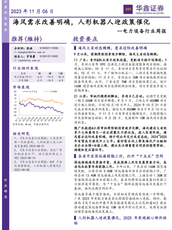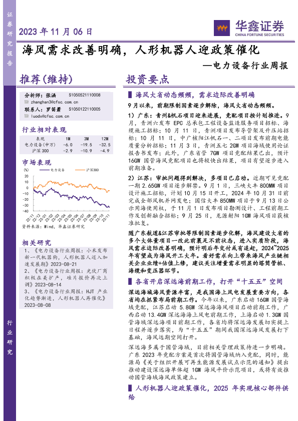 【华鑫证券】【20231106】电力设备行业周报:海风需求改善明确,人形机器人迎政策催化-16页