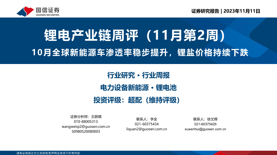 【国信证券】【20231111】锂电产业链周评(11月第2周):10月全球新能源车渗透率稳步提升,锂盐价格持续下跌-20页