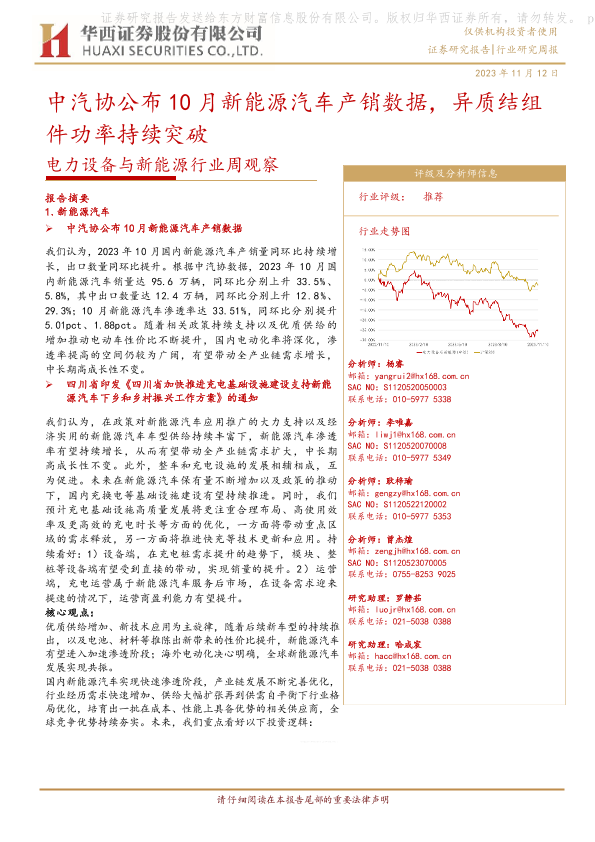 【华西证券】【20231112】电力设备与新能源行业周观察:中汽协公布10月新能源汽车产销数据,异质结组件功率持续突破-29页