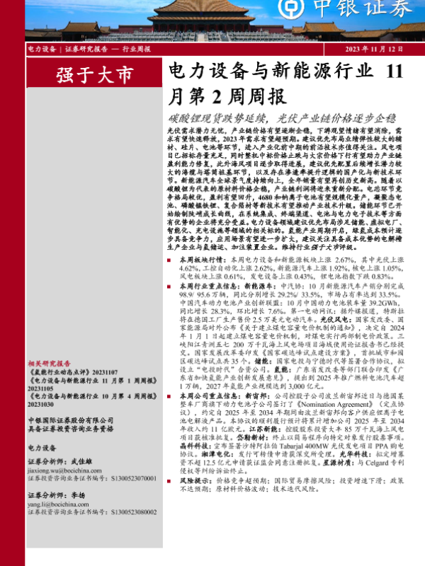 【中银证券】【20231112】电力设备与新能源行业11月第2周周报:碳酸锂现货跌势延续,光伏产业链价格逐步企稳-14页