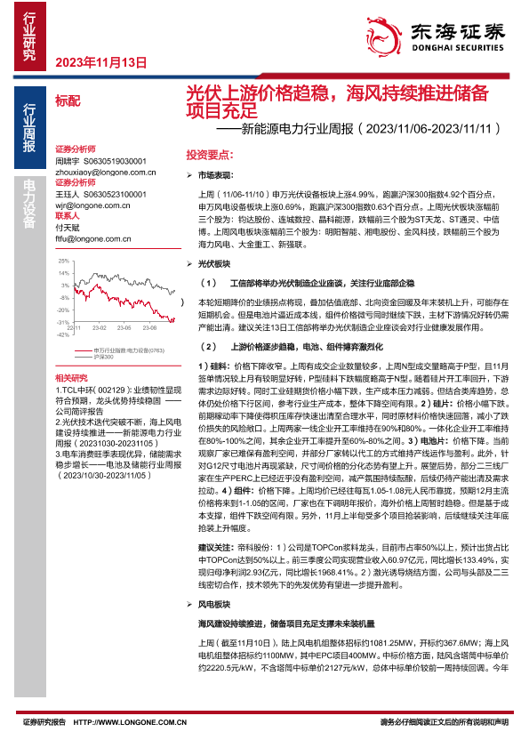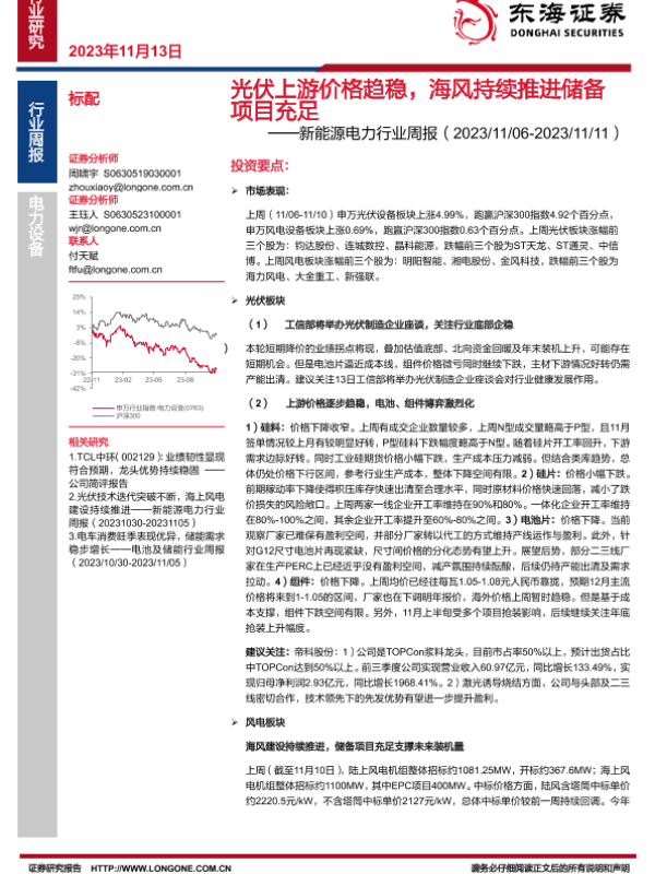 【东海证券】【20231113】20231113-东海证券-新能源电力行业周报:光伏上游价格趋稳,海风持续推进储备项目充足-16页