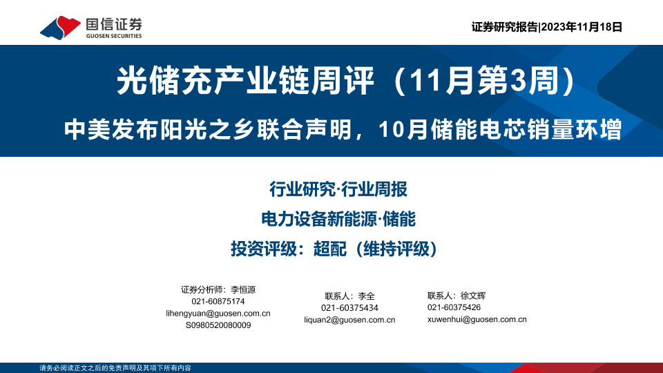 【国信证券】【20231118】光储充产业链周评(11月第3周):中美发布阳光之乡联合声明,10月储能电芯销量环增-26页