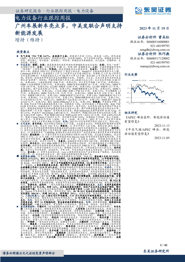 【东吴证券】【20231119】电力设备行业跟踪周报:广州车展新车亮点多,中美发联合声明支持新能源发展-41页