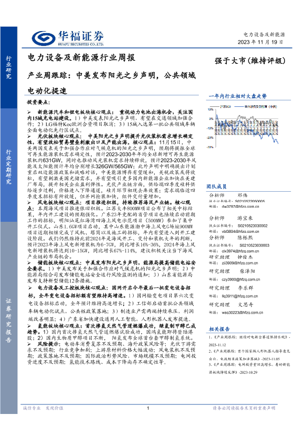 【华福证券】【20231119】电力设备及新能源行业周报:产业周跟踪:中美发布阳光之乡声明,公共领域电动化提速-16页