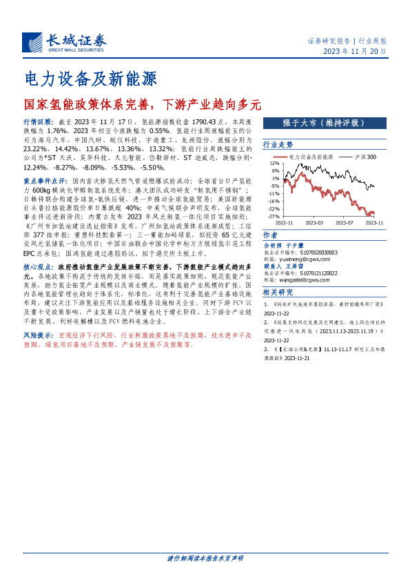 【长城证券】【20231120】20231120-长城证券-电力设备及新能源行业周报:国家氢能政策体系完善,下游产业趋向多元-11页
