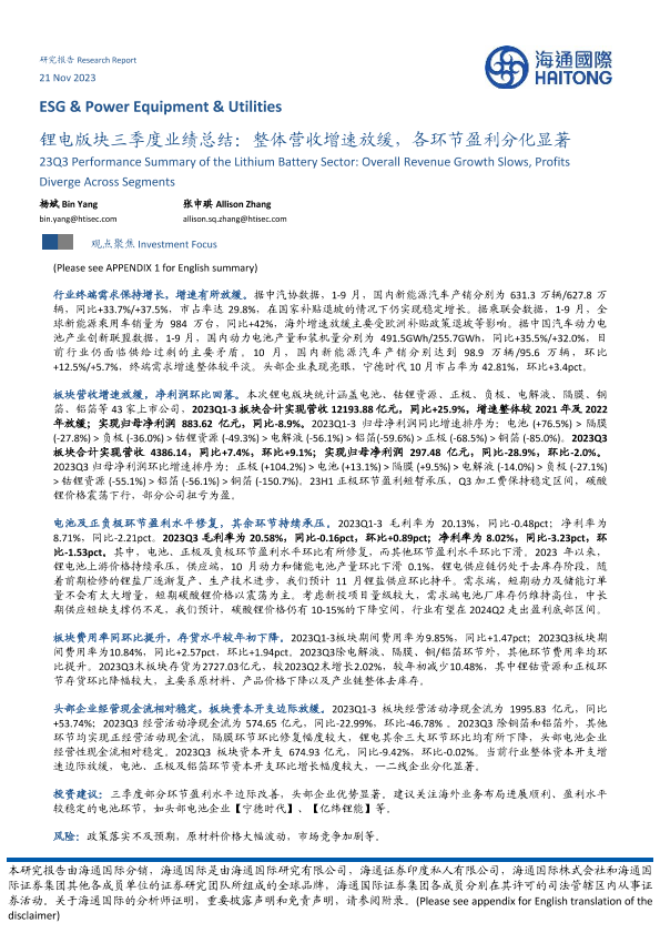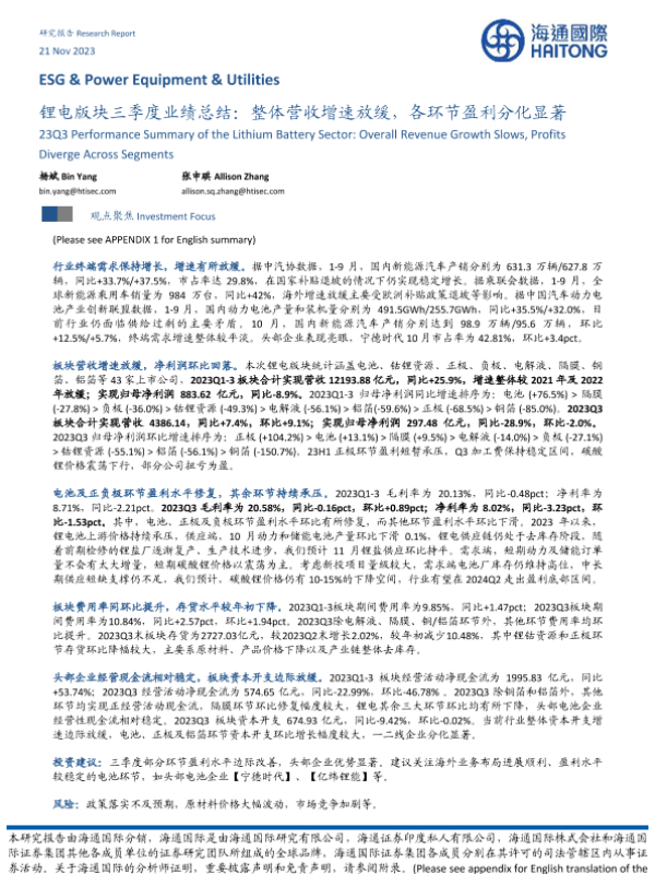 【海通国际】【20231121】锂电版块三季度业绩总结:整体营收增速放缓,各环节盈利分化显著-11页