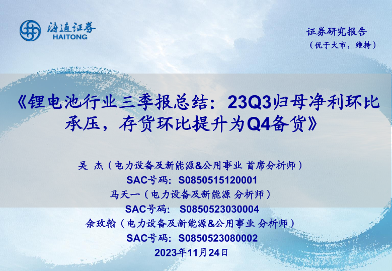 【海通证券】【20231124】锂电池行业三季报总结:23Q3归母净利环比承压,存货环比提升为Q4备货-22页